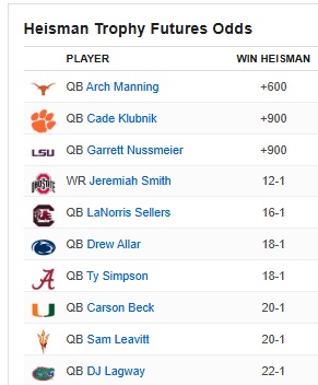 If Texas and Clemson are as great as people think they'll be, this feels like a pre-ordained duel between Arch Manning and Cade Klubnik. Sure, there'll inevitably be receivers and running backs who pop into the discussion over the course of the season, but I can't shake the feeling that we're headed back to the drab QB arguments that've dominated most Heisman races for the past 20 years.