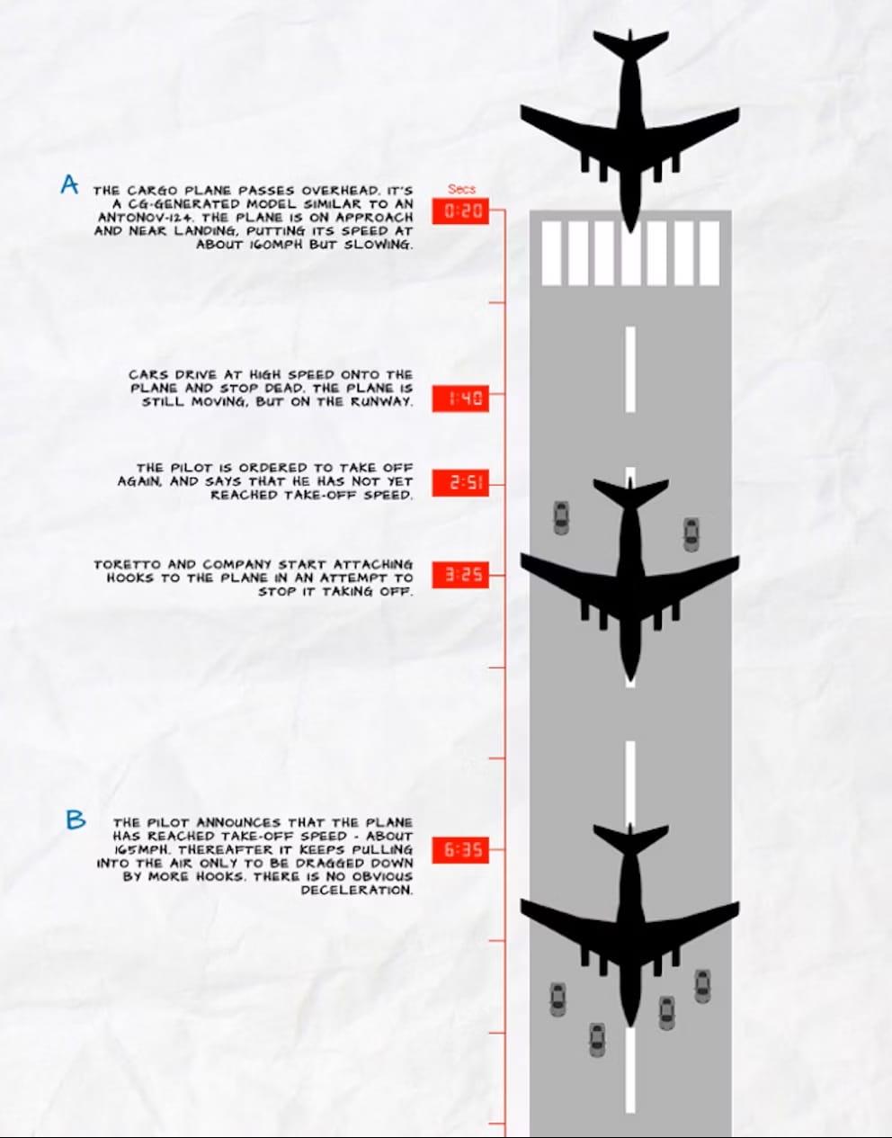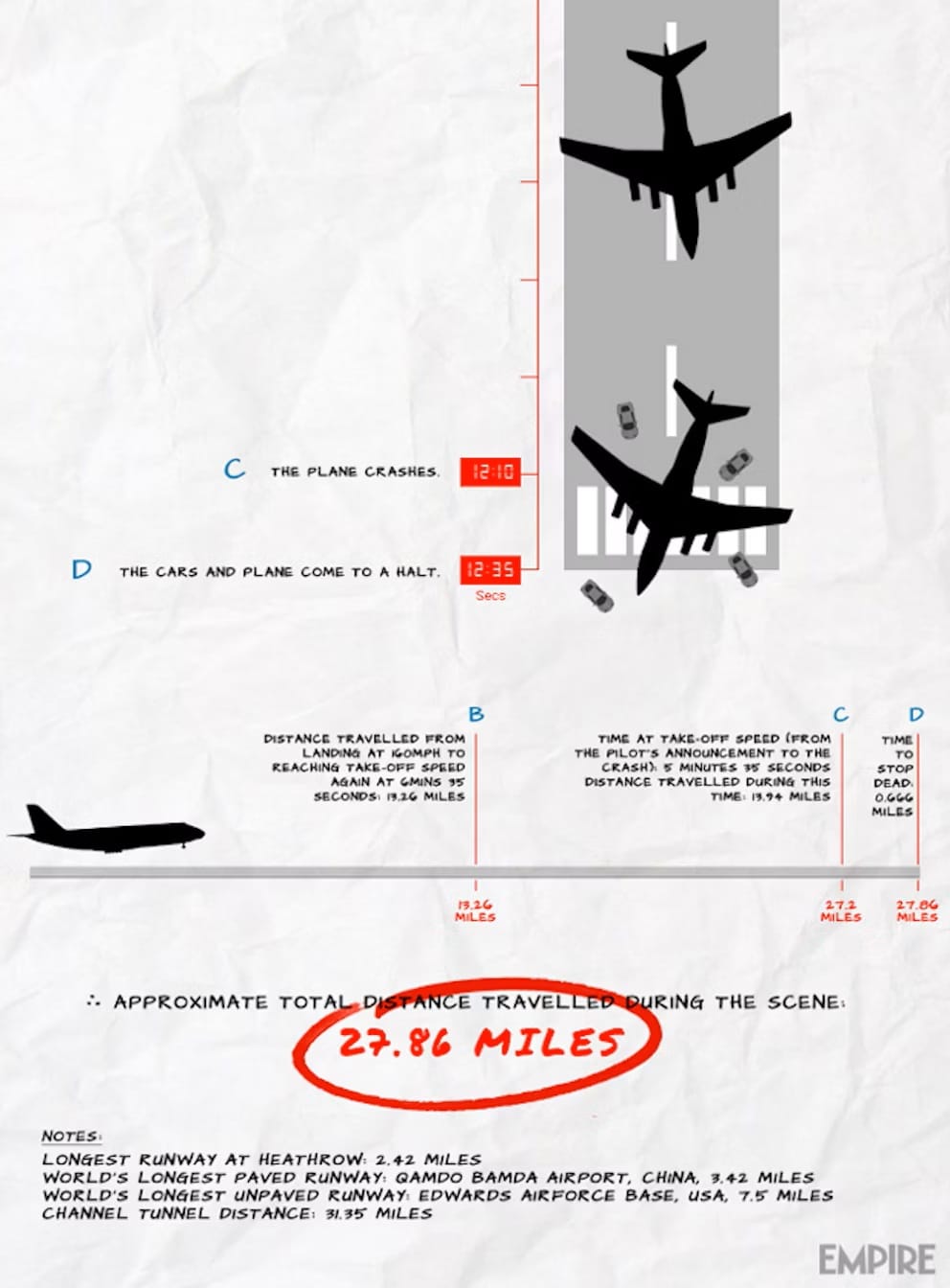 This scene holds an infamous place in movie physics history. It lasts so long (almost 13 minutes) that people calculated the runway would have to be between 18 and 28 miles long to exist in reality: