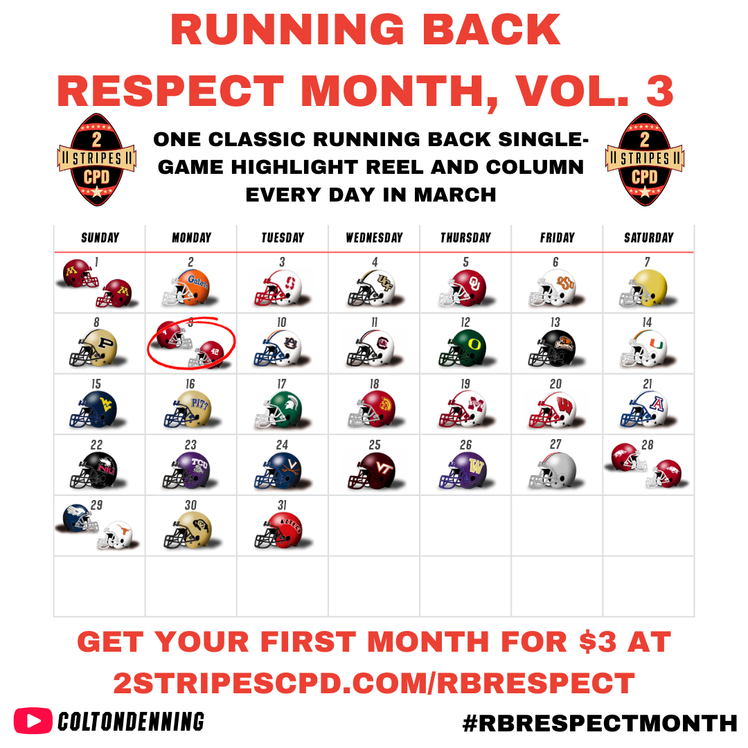 Welcome to day nine of Running Back Respect Month! Yesterday, we paid homage to Mike Alstott and the importance of the fullback position to the game of football. Here's where we're at today, and how the rest of the month looks: