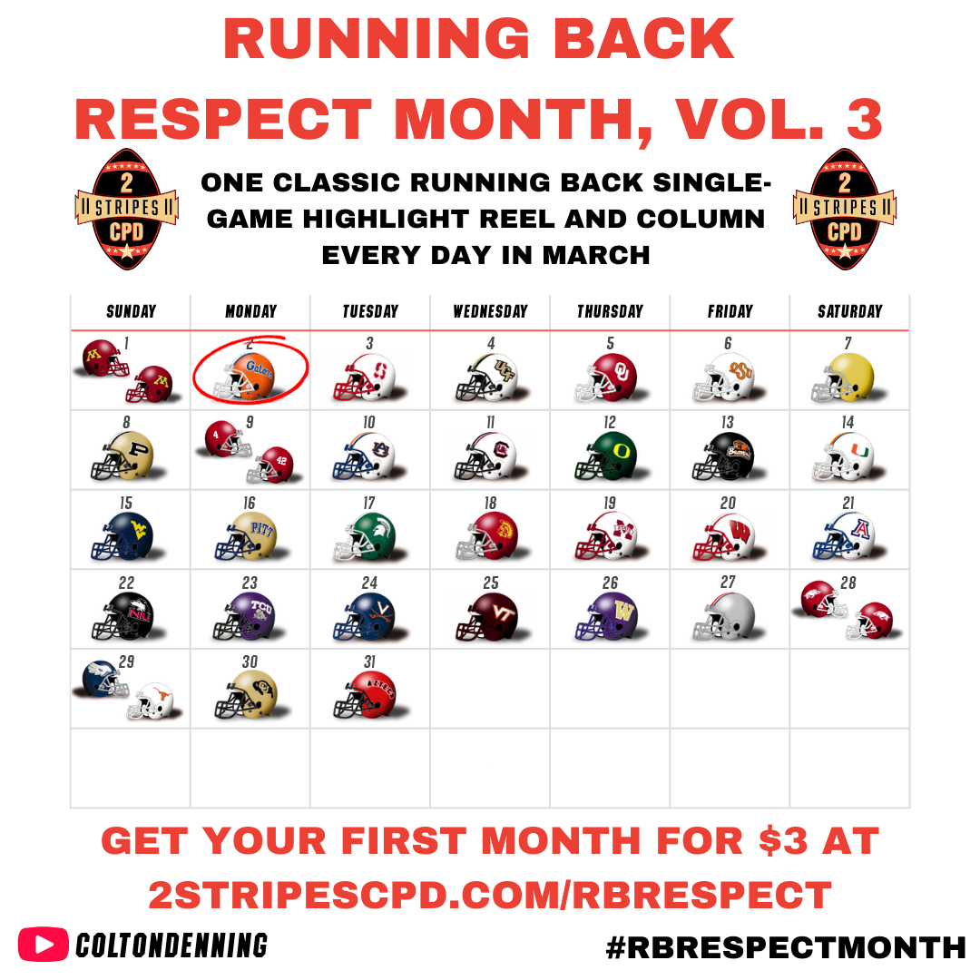 Welcome to day two of Running Back Respect Month! Yesterday, We paid homage to one of the greatest RB duos of all-time in Minnesota's Marion Barber III and Laurence Maroney. Here's where we're at today, and how the rest of the month looks: