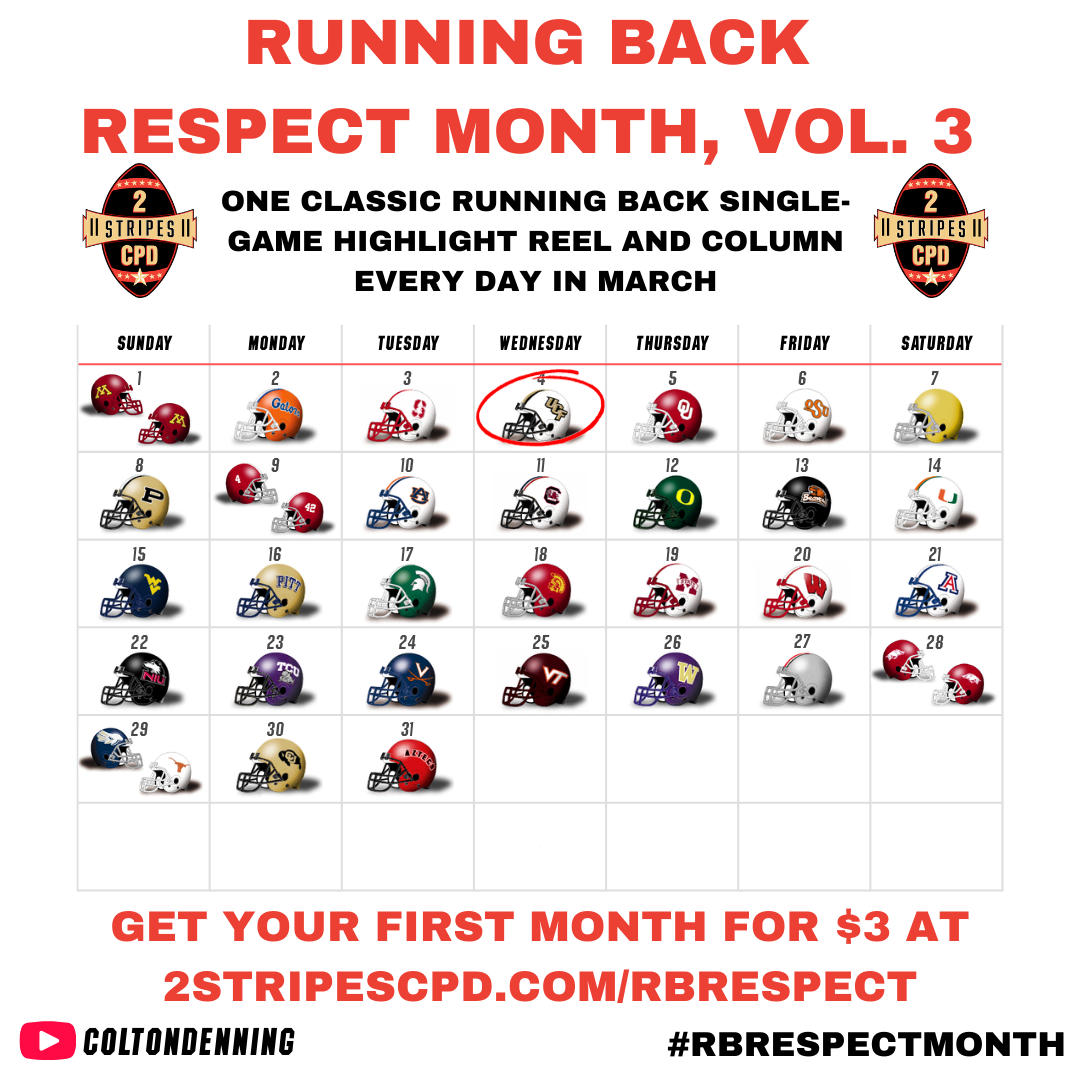 I wish everyone –including myself– got to watch more of Kevin Smith at UCF. He had a unique blend of size, power, and speed that made him devastating in the open field when he hit a crease. It sucks that he didn't get more of a national spotlight, but it's also kind of cool that UCF fans can always play the, "No, you'll never truly understand how great this guy was," card with the rest of us whenever he's mentioned.