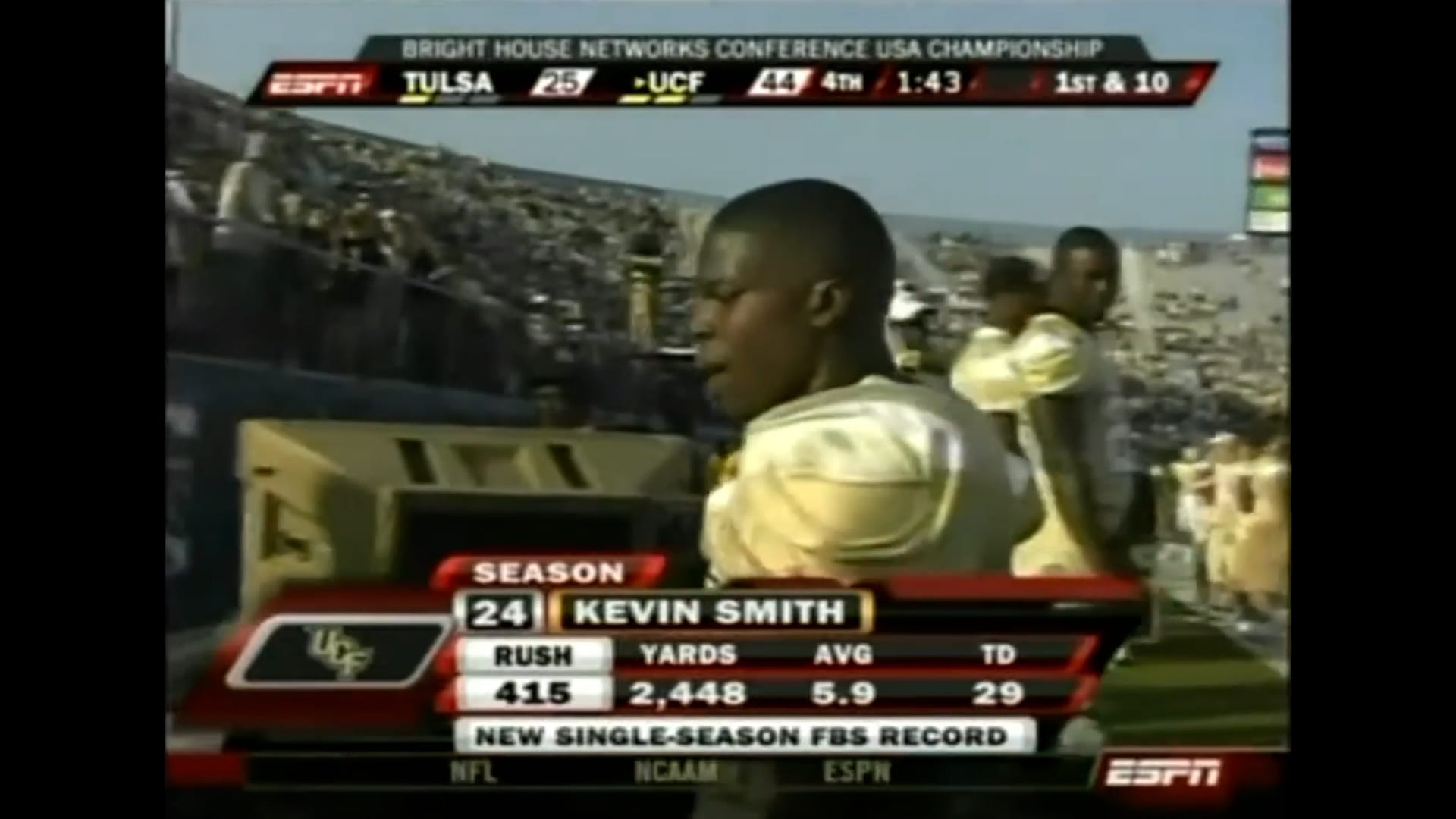 Unlike McFadden, Hart, and Rice, Smith still had one game left to make a Heisman statement before voting closed - this time on a national stage. UCF's Conference USA Title matchup against Tulsa being on ESPN gave the majority of the nation their first opportunity to watch him play. He didn't disappoint. In the span of three-and-a-half hours, the conversation about Smith went from, "Who is he?" to "Wow, this is a neat story!" to, "Is this kid going to break the single-season rushing record?!" after he ran for 284 yards and four touchdowns in UCF's 44-25 win: