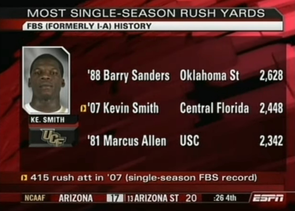 That's a total of 1,249 yards (a 208-yard average!) and 15 total TD in six games. Put it all together and Smith led the nation in both rushing yards (2,164) and touchdowns (26), while powering UCF to a 9-3 record and the Conference USA Title Game. He was just the 13th 2,000-yard rusher ever in FBS at the time. Despite his individual and team accomplishments, Smith still didn't get the respect he'd earned. His Heisman buzz was nearly non-existent - which would've made more sense if he hadn't put up big numbers against both NC State and Texas. Adding to the disrespect, he wasn't even named a Doak Walker finalist, awarded to the nation's top running back. Arkansas' Darren McFadden, Michigan's Mike Hart, and Rutgers' Ray Rice earned that distinction, with McFadden taking it home for a second-straight season. All three had great years in their own right, but the leading rusher and scorer in the country can't at least get a top-three finish?
