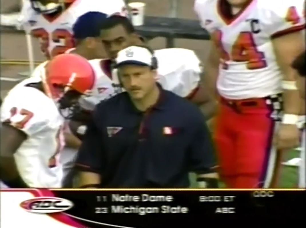 Against the defending national champions, McNabb threw for 233 yards and three TDs on 21-27 passing, while also running 19 times for 75 yards and one jaw-dropping TD where he lost his shoe mid-play. I'm convinced he could've thrown for 400-plus and five or six touchdowns if the game situation would've called for it. Michigan had no answers for him or the Syracuse offense, and even though the game finished 38-28, this was a certified ass-kicking. Syracuse was up 38-7 with less than 10 minutes left, and McNabb was lounging on the sidelines with a young, HAT-WEARING Steve Addazio: