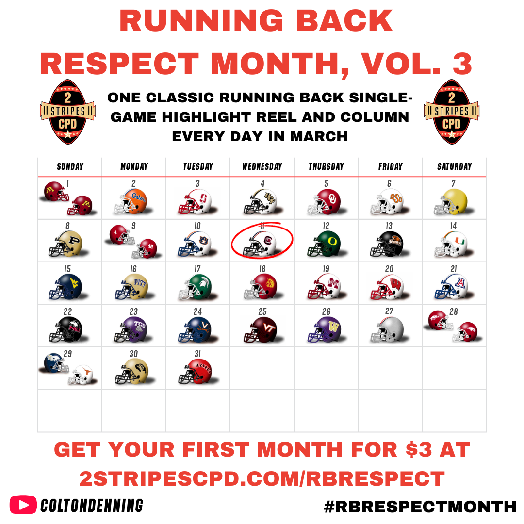 Welcome to day 11 of Running Back Respect Month! Yesterday, we gave Rudi Johnson his deserved flowers for a spectacular 2000 season at Auburn. Here's where we're at today, and how the rest of the month looks:
