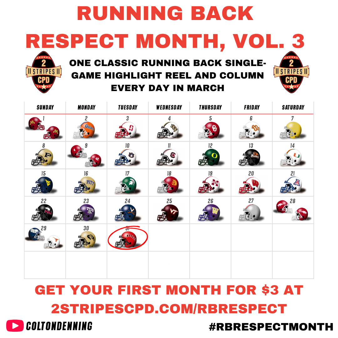 Thank you for your support, and welcome to the final day of Running Back Respect Month, Vol. 3! Yesterday, Rashaan Salaam gave Colorado fans a memory they'll never forget when he clinched the 1994 Heisman Trophy. Let's have one more look at the RBRM calendar before we get started: