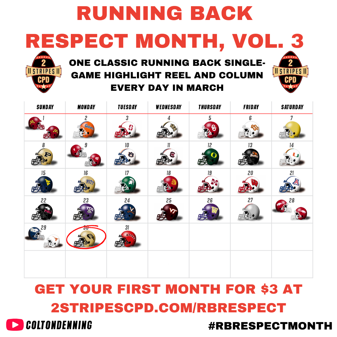 The game itself was closer to start the fourth quarter (20-13) than they would've liked, but the Buffs achieved both goals in style by the end. Salaam ripped off 259 yards and 2 TD in a 41-20 win, breaking the 2,000-yard barrier, while clinching the program's first-ever Heisman Trophy: