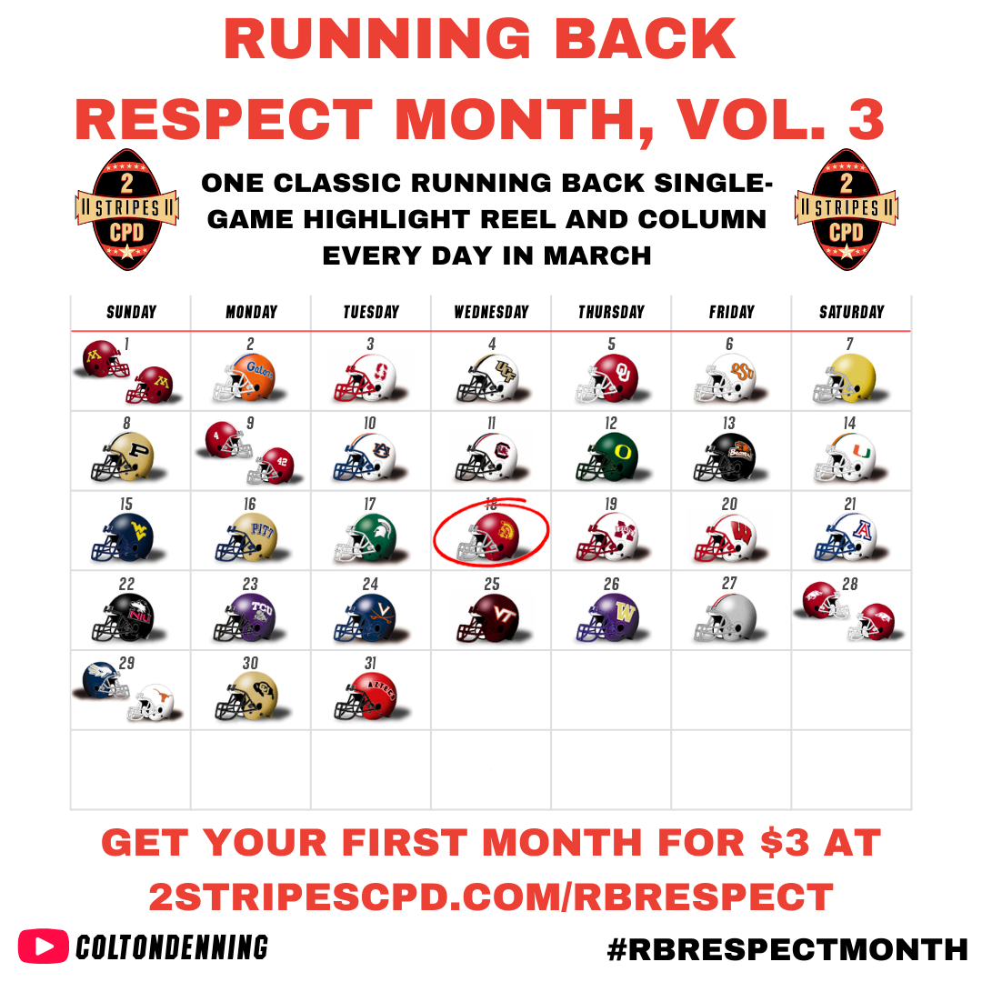 Welcome to day 18 of Running Back Respect Month! Yesterday, we made the case for how Javon Ringer shifted the balance of the Michigan State-Michigan rivalry in the late-2000s. Here's where we're at today, and how the rest of the month looks: