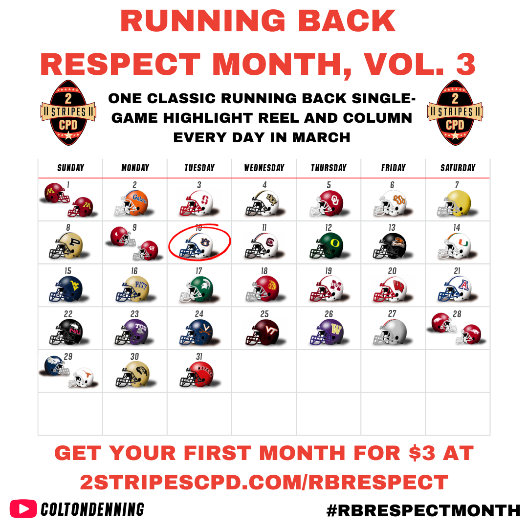 Welcome to day ten of Running Back Respect Month! Yesterday, Alabama put on ground game masterclass in the 2012 SEC Championship with Eddie Lacy and TJ Yeldon. Here's where we're at today, and how the rest of the month looks:
