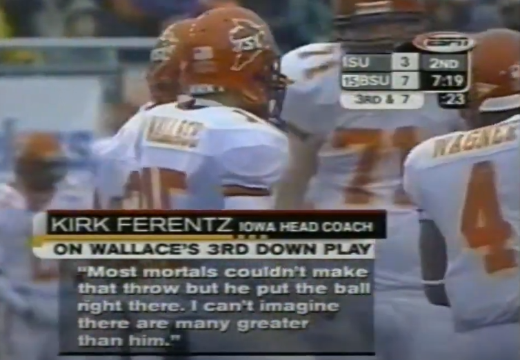 Wallace led Iowa State to a 36-31 comeback win over the Hawkeyes after trailing 24-7 at half. He went 23-37 for 361 yards and two total touchdowns, handing Iowa a home loss what would be their only regular season defeat of 2002. All people could talk about afterwards was Wallace - especially this third down throw he made from his own endzone in the fourth quarter: