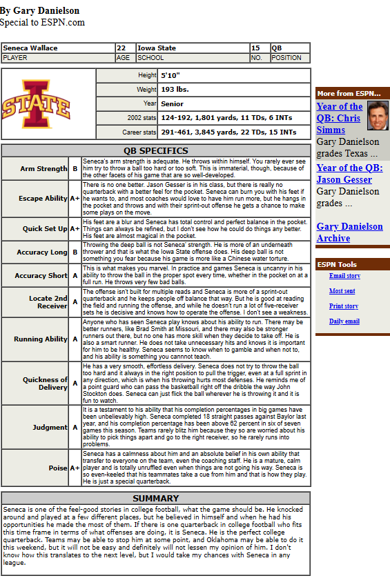 This isn't to say he was the perfect quarterback by any means, either. He had more than a few stinkers that exposed how raw he was, and just how far Iowa State had to go to become a true Big 12 contender. They were ranked as high as ninth in 2001, before losing six of their final seven to finish 7-7. It could've been better, though, given a botched call in their season opener against Florida State that took a clear Wallace TD off the board in the final seconds: