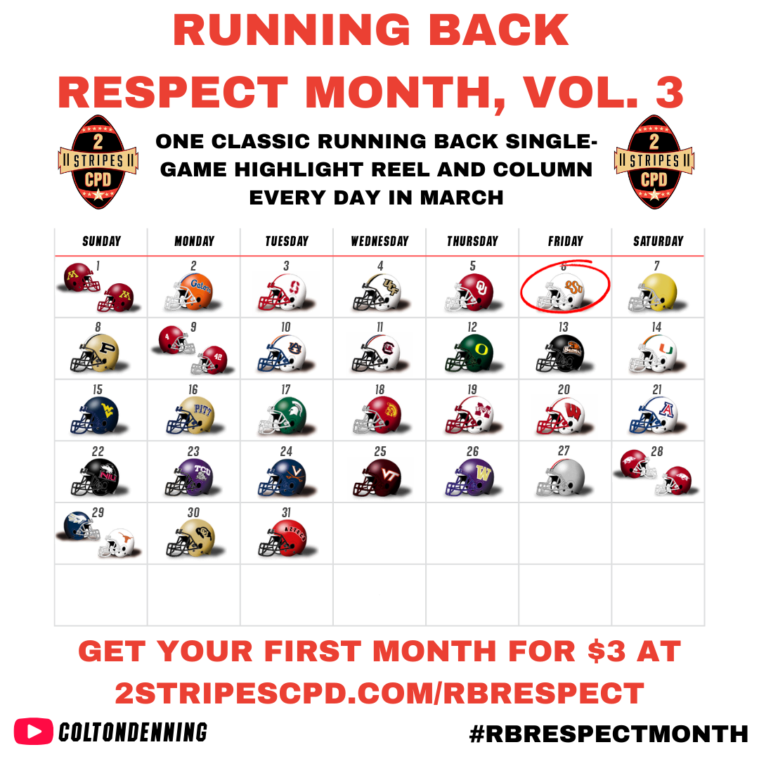 Welcome to day six of Running Back Respect Month! Yesterday, we had a therapy session for Texas fans about Oklahoma RB Quentin Griffin. Here's where we're at today, and how the rest of the month looks: